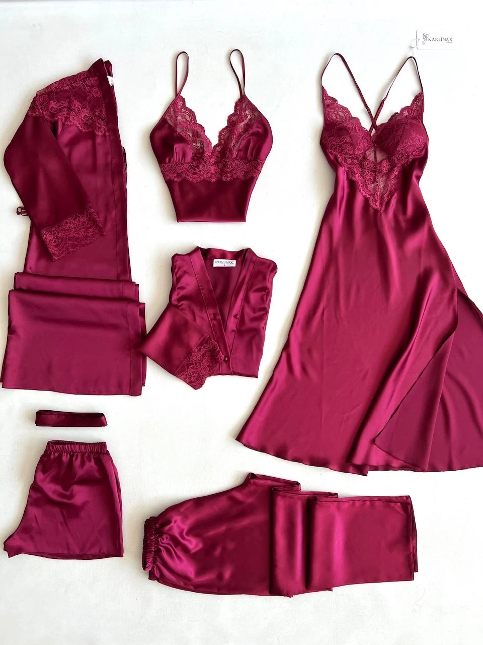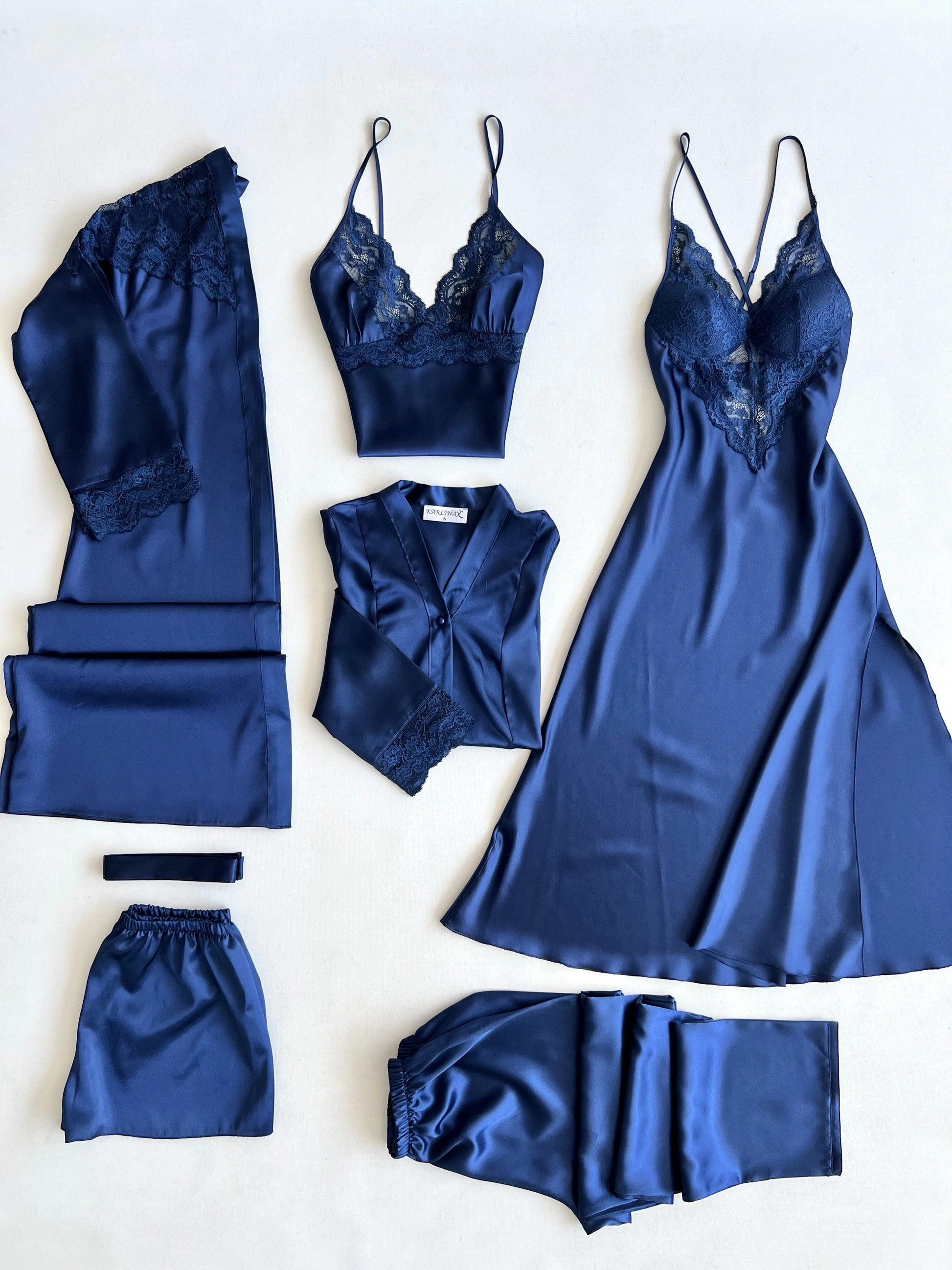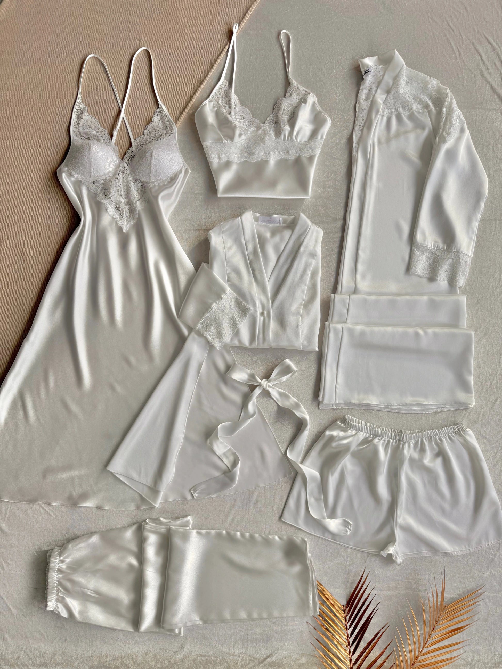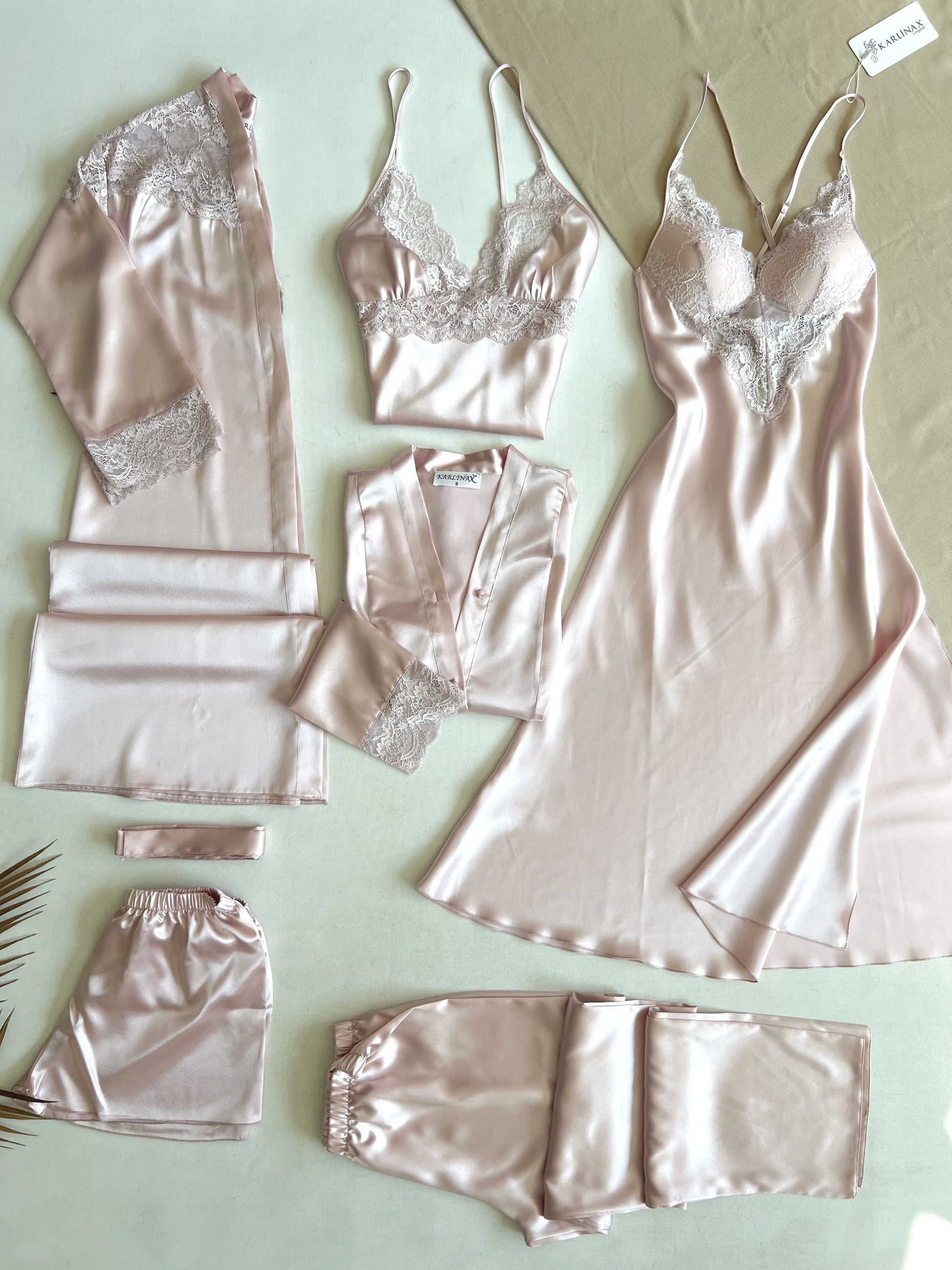 تمتعي بأناقة لامتناهية من الصباح حتى المساء مع طقم 'الريم' الفاخر المكون من ٦ قطع من الساتان، والمصمم ليبرز جمال قوامكِ برقة وأصالة.