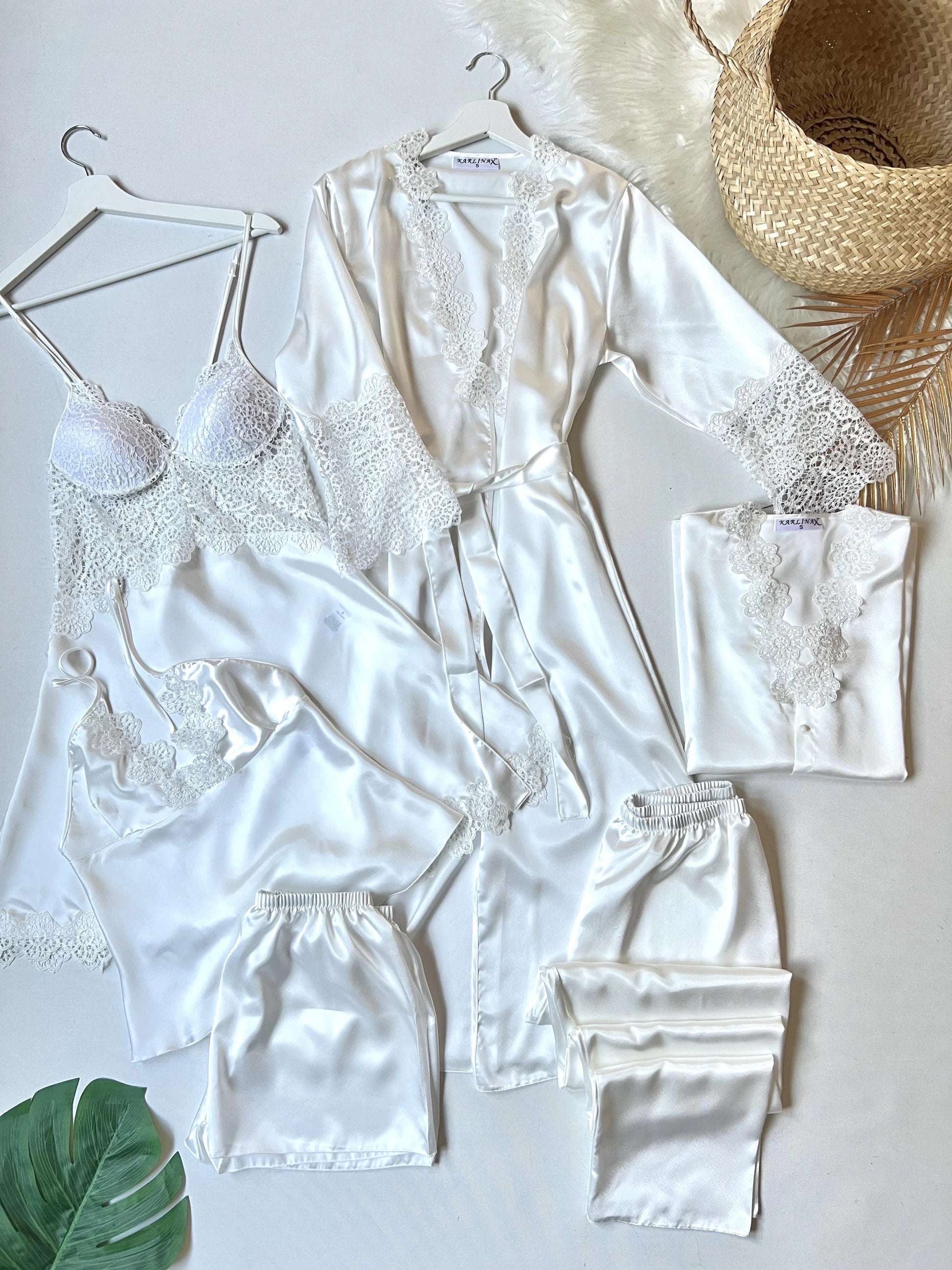 تألقي بفخامة طقم 'أثير' المكون من ٦ قطع، حيث يجتمع رقي قميص النوم القصير مع سحر الروب الطويل ليمنحكِ إطلالة ملكية تفيض برقة المُهرة.