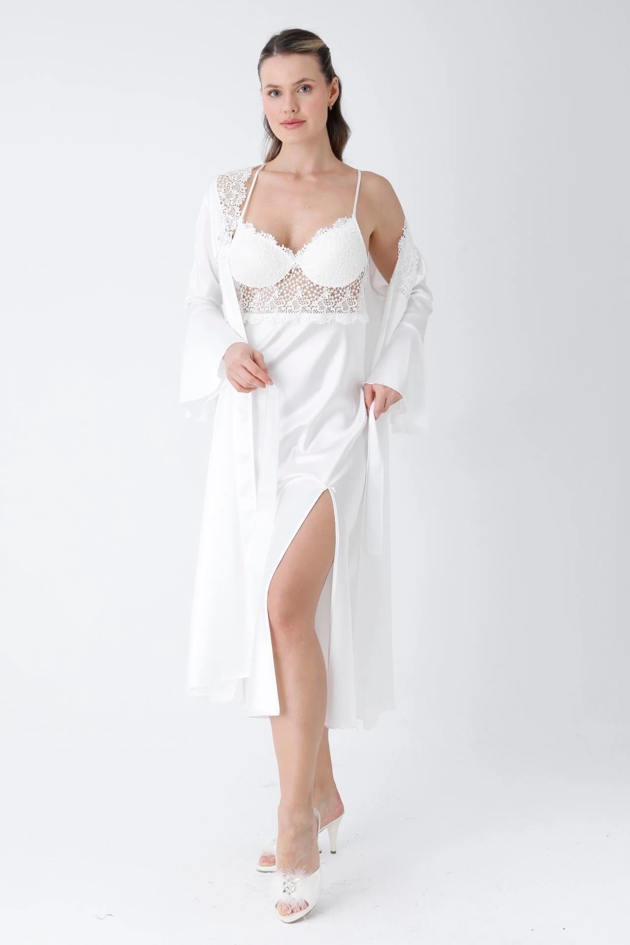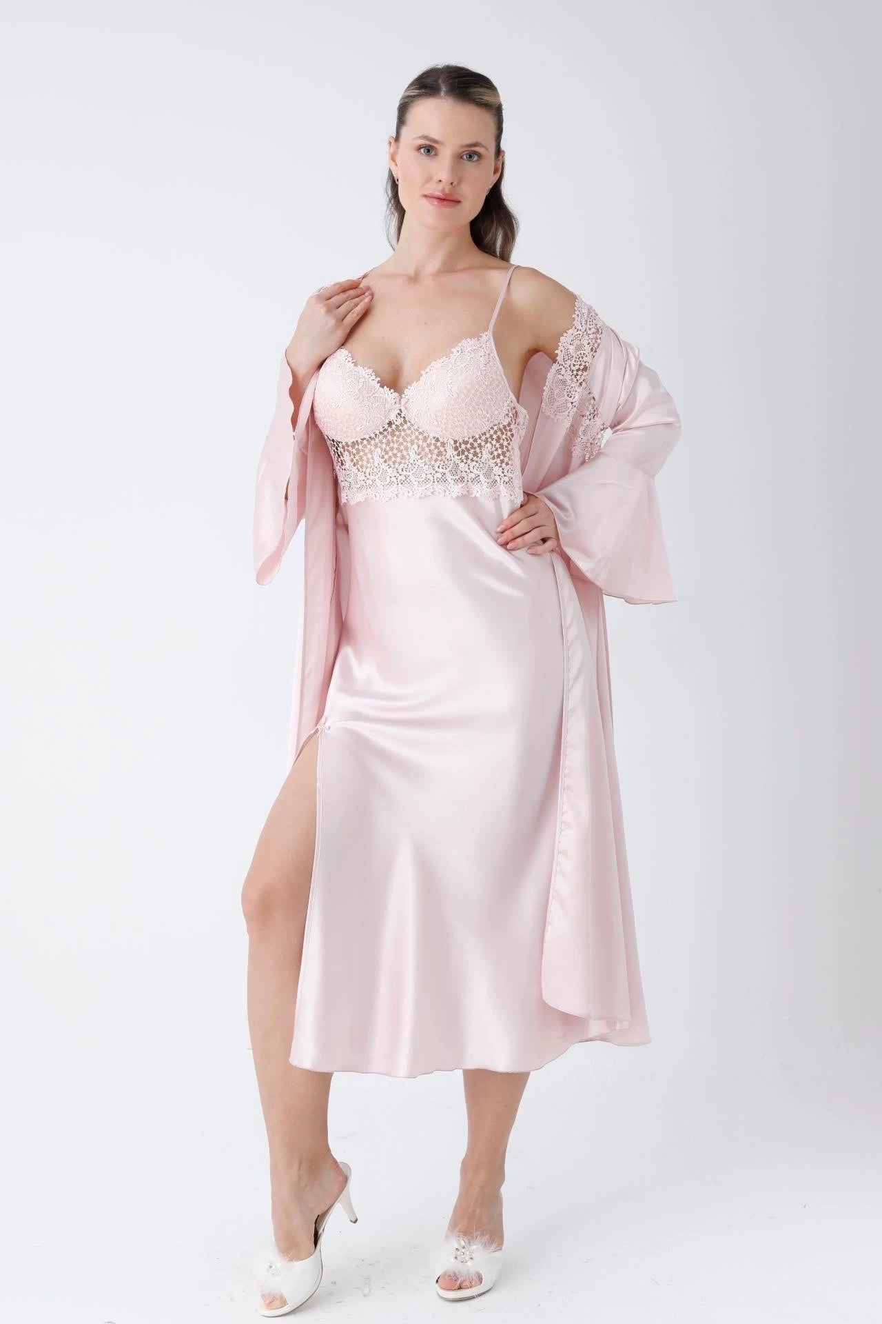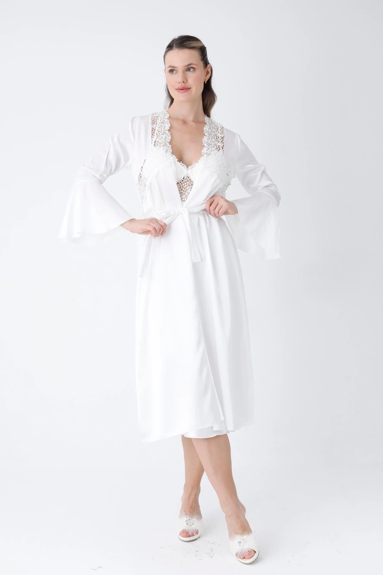 تطريز دانتيل فاخر: يتميز قميص النوم والروب بتطريز دانتيل خاص يضفي لمسة من الرقي الكلاسيكي.