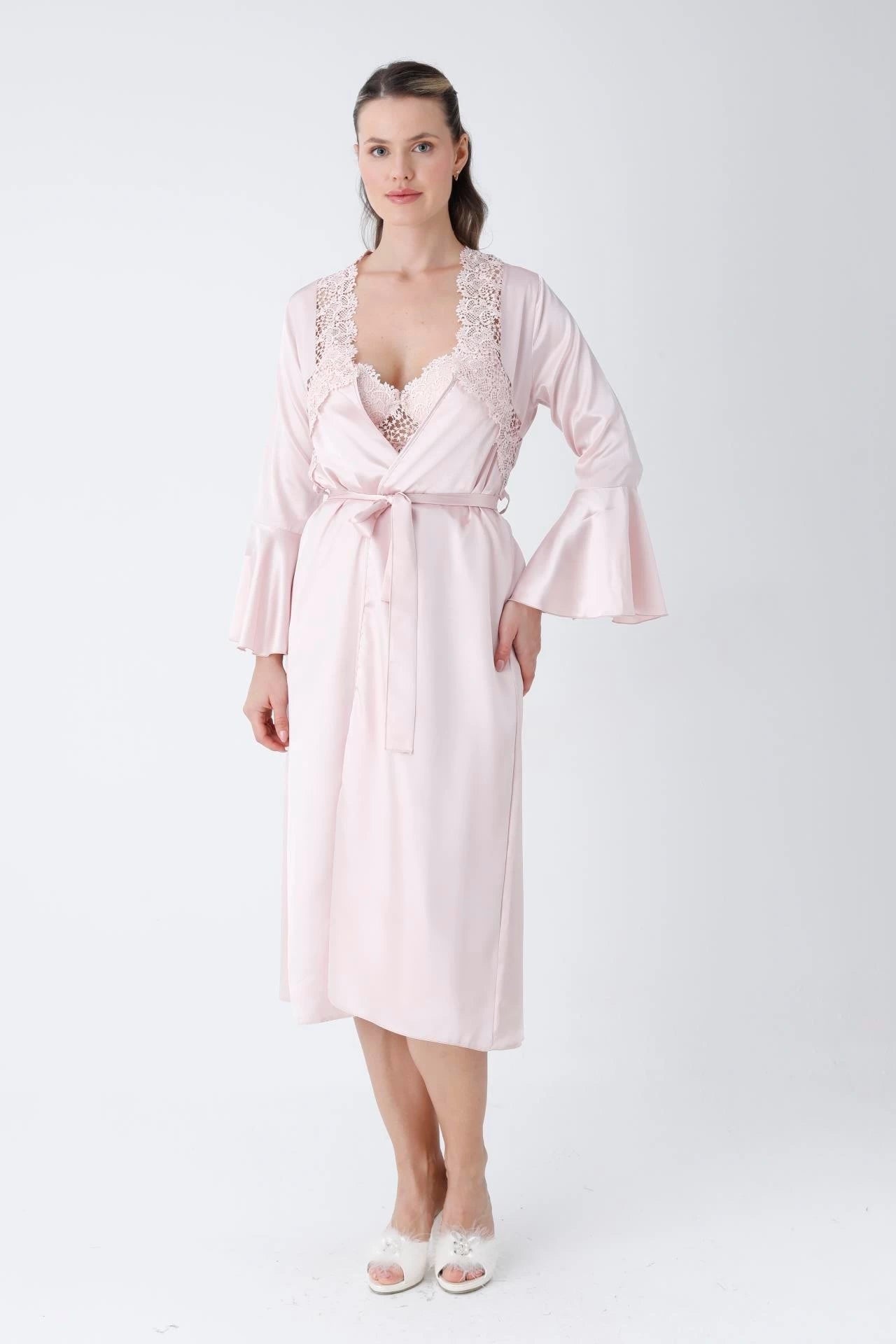 أناقة "ليان": يتميز الروب بتفاصيل كشكش على الأكمام مع حزام ساتان لتحديد الخصر بكل أنوثة.