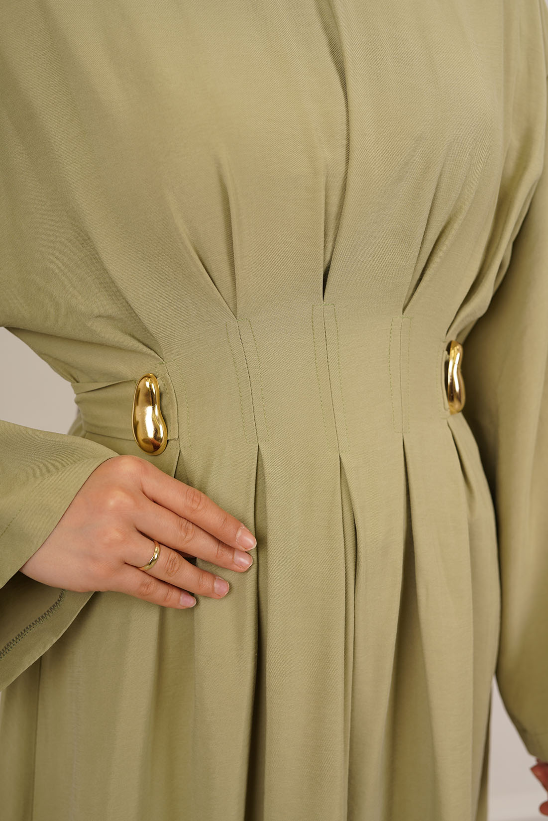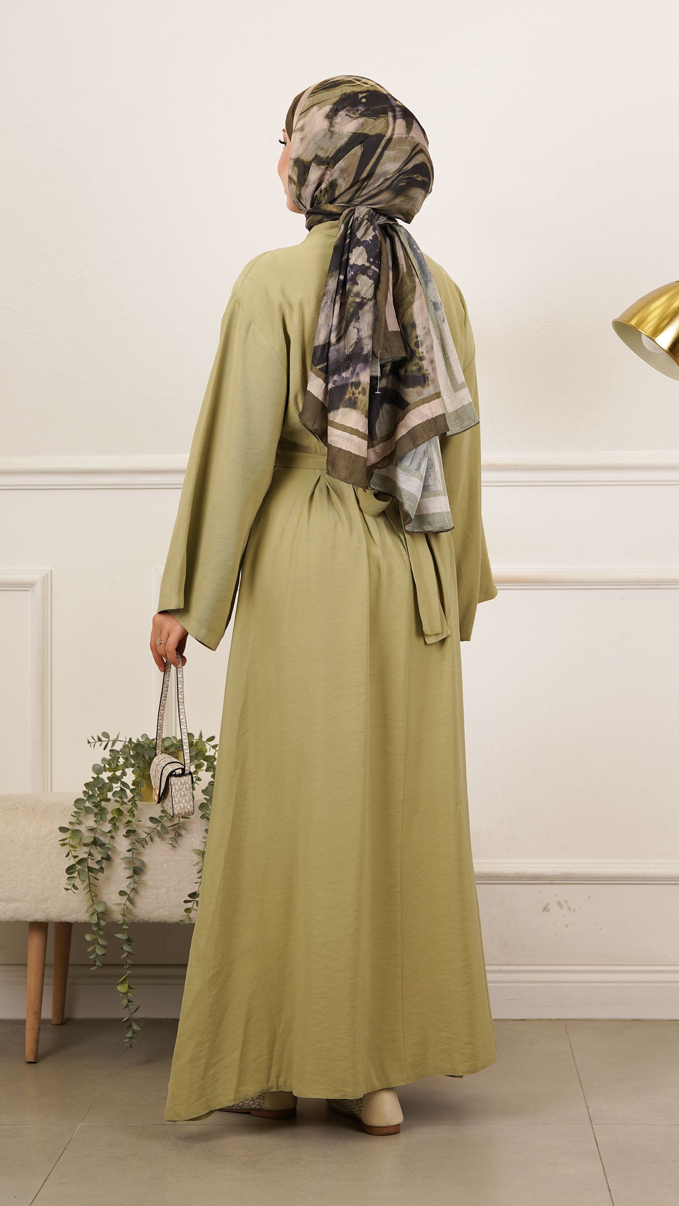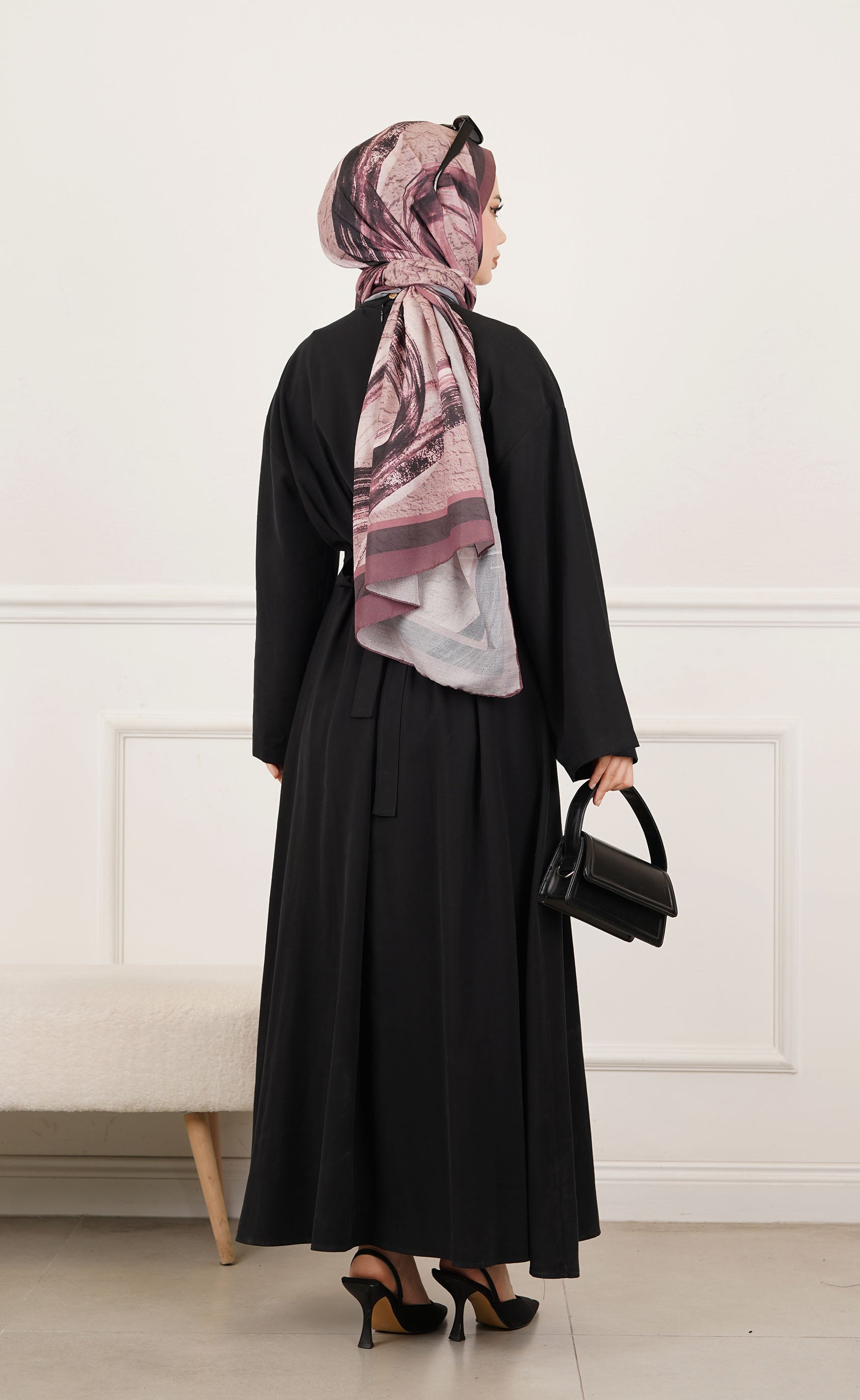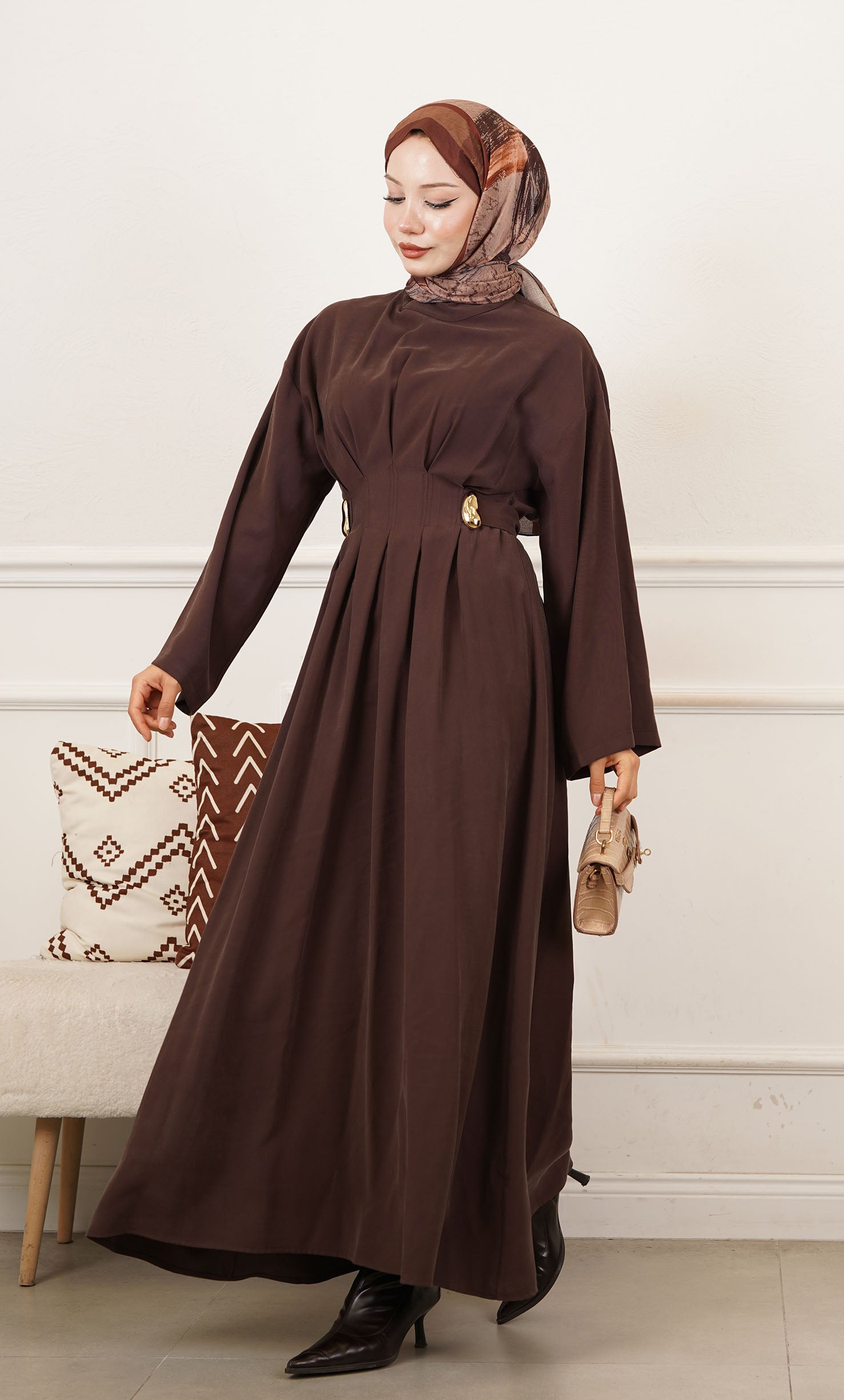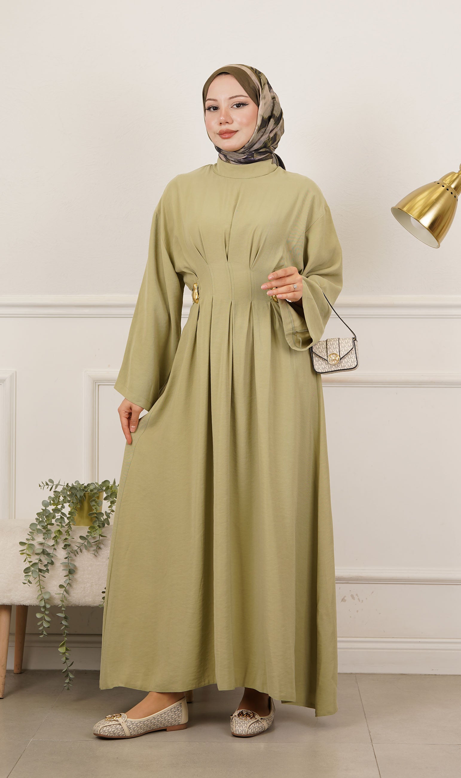 لو تدورين على فستان يخليكِ "الكل يسأل عنك" في أي مشوار، هذا هو طلبك! يجي بقصة "A-Line" الواسعة اللي تريحك في الحركة، وبنفس الوقت يضبط الخصر بلمسة ناعمة بفضل كسرات "البليسيه" اللي قدام، تعطي فخامة خيالية للقطعة.